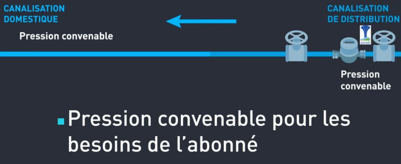 la pression est stable et convenable pour les besoins de l'abonné. Une vanne est présente pour isoler la canalisation du reste du réseau en cas d'intervention d'un technicien, puis un clapet de retenue empêche les retours d'eau et la contamination de tout le réseau;